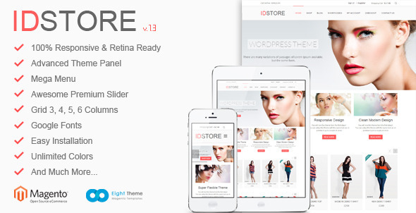 [ Latest Update 1.3 (October 25, 2013) Fixed : Remove from cart on cart page bug Fixed : Removed php short tags Fixed : Minor css Compatibility: 1.7.0.0, 1.7.0.1, 1.7.0.2, 1.8.0.0 IDStore Responsive Multi-Purpose Ecommerce Theme – is a professionally developed, high-quality, functional template for the sites working on Magento. Unique and up-to-date design of the l]